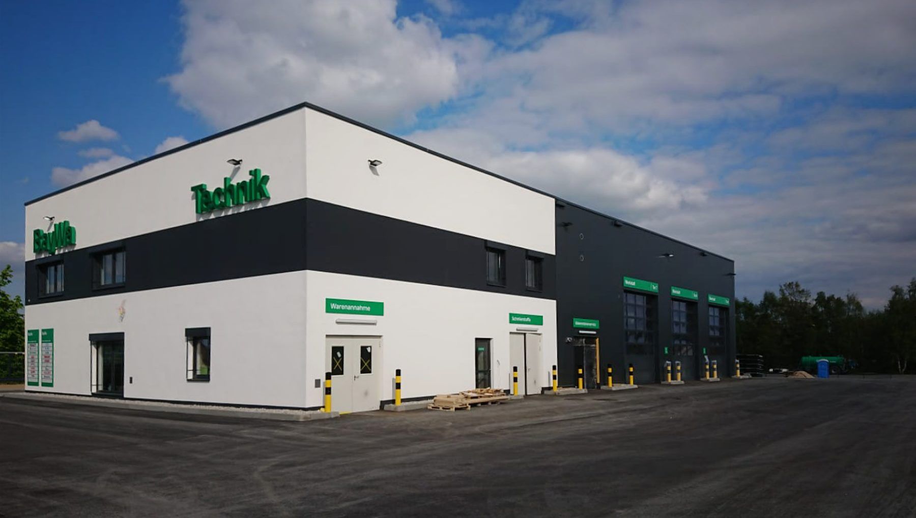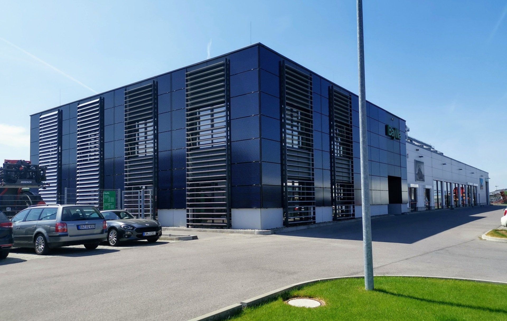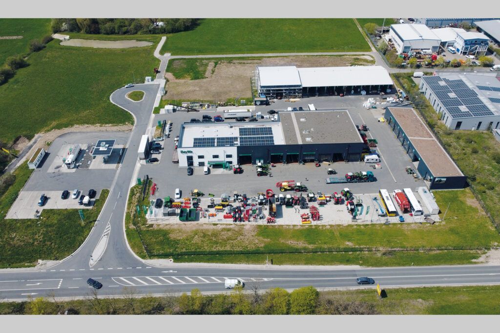 Neubau Gebrauchtmaschinenzentrum bestehend aus 2-geschossigen Bürogebäude mit Ausstellungshalle und Seminarraum, Landtechnik-Werkstatt, Waschhalle und zwei Unterstellhallen; Fertigstellung 2015.