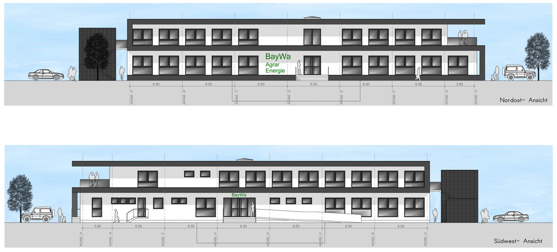 Neubau Agrarbetrieb bestehend aus Bürogebäude mit Stückgutlagerhalle und Pflanzenschutzmittellager, Düngerlagerhalle und Getreideanlage; Fertigstellung 2008; Planung als Angestellter der BayWa AG