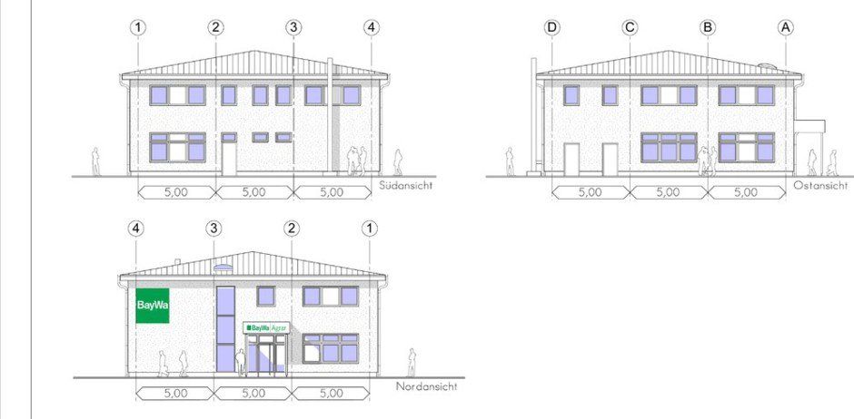 Neubau Agrarbetrieb bestehend aus Bürogebäude mit Stückgutlagerhalle und Pflanzenschutzmittellager, Getreideanlage und Düngerlagerhalle; Fertigstellung 2006; Planung als Angestellter der BayWa AG
